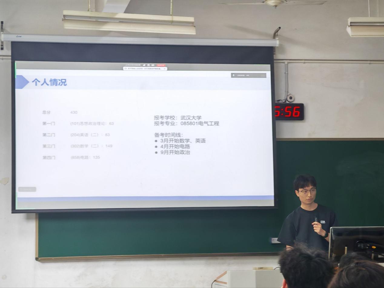 李承杰同学带来了详实的考研全科备考攻略。他从考研时间线入手,系统梳理了政治、英语、数学、电路四门科目的复习节奏与方法。他强调“英语最重要的是背单词”,并推荐掌握高频考点贯穿始终;数学方面坚持“做题 > 看课”,建议严肃模拟、错题复盘;电路则建议报班系统学习,广泛练习近年真题。他还特别提醒同学们保持锻炼、远离干扰、合理休息,坦言“考研是一场马拉松,不要高估自己的毅力,也不要低估自己的实力”
