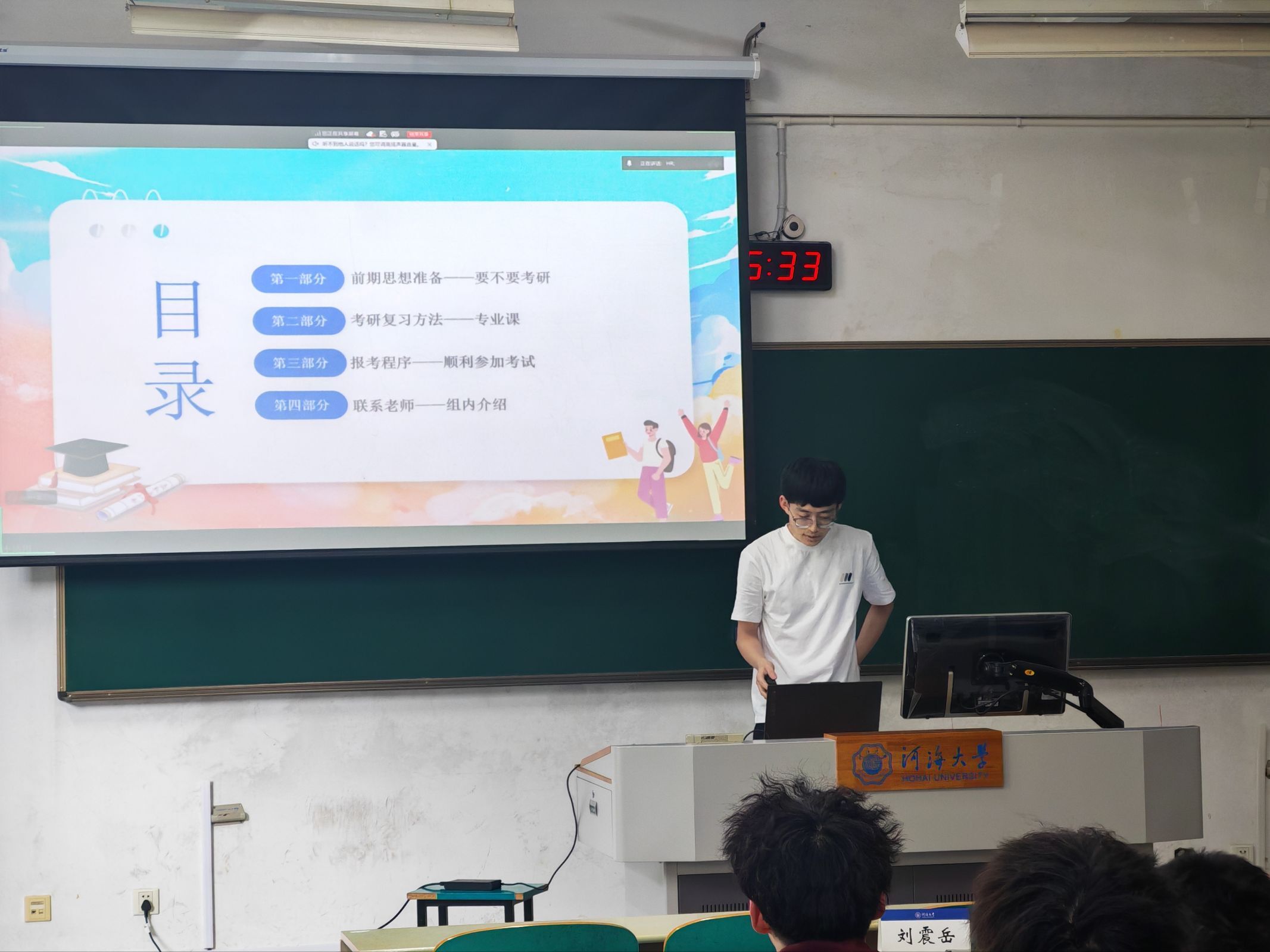 刘震岳同学则聚焦考研专业课与报考程序,带来极具实操性的建议。他提醒同学们“先确定院校,为目标努力”,避免盲目报考,同时关注官网动态以防专业课改考。在专业课备考上,他主张分阶段推进:前期梳理框架、暑期强化做题、秋季真题训练、考前全真模拟。他还详细介绍了报考程序中的关键节点,如预报名、正式报名、线上确认、准考证打印等,并鼓励有意报考色花堂 的同学提前联系导师,做到“少鸽子、讲诚信”。
